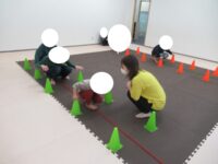 アヒル歩きでコーンタッチ!数字を読み上げながら楽しくタッチできたね。