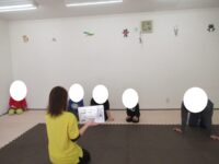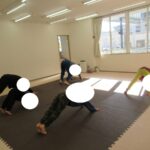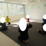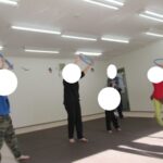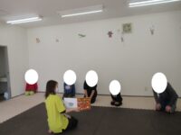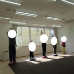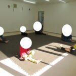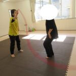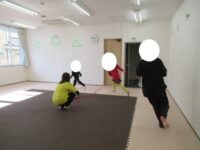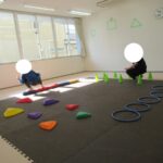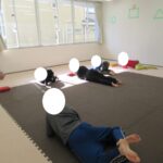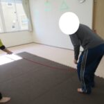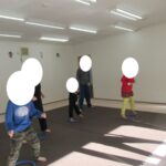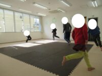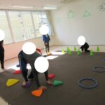 アヒル歩きでコーンタッチ、一本橋でカニ歩き、カラー石でクマ歩き、フープで連続ジャンプをしました。