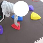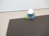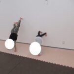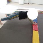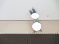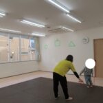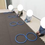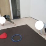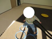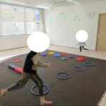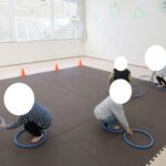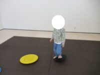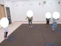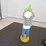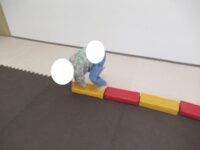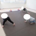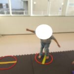 カラー石でクマ歩き、フープで両足ジャンプ、方向転換ジャンプ、平均台では横クマ歩き、片足クマなどにチャレンジしました。
