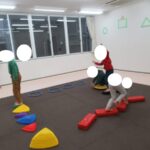 ジグザグ道でクマ歩き、バランスボードで煙突や石のポーズ、フープで両足ジャンプ、カラー石渡りでは上、横の順に手を動かしながら進みましょう。