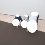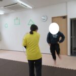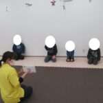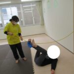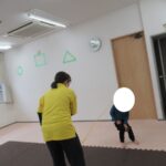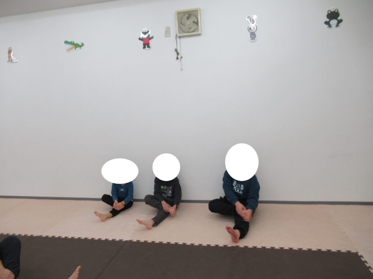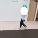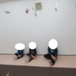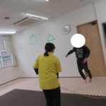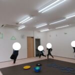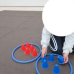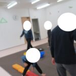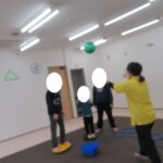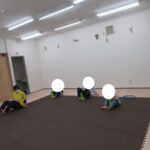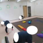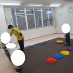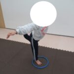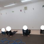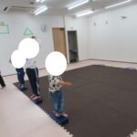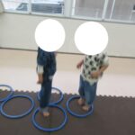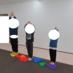 フープジャンプ、バランスボードでボールパス、平均台でクマ歩き、カラー石渡りを行いました。