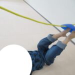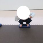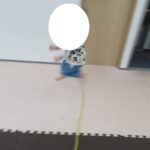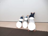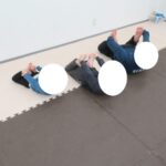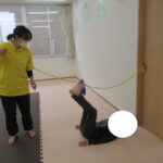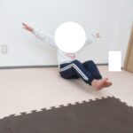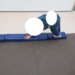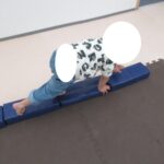 足でカップを頭の方へ移動させます。逆上がりの足の動きにも繋がる運動です~