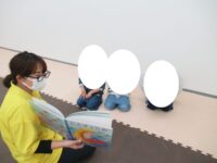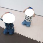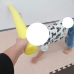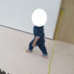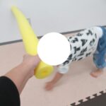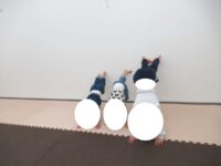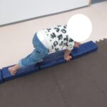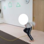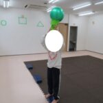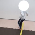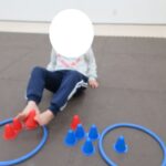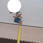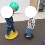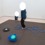 一本橋でクマ歩き、カラー石でバランス渡り、バランスボードでボールキャッチ、フープでグーパージャンプにチャレンジ!