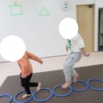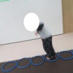 しっかりとこらえてグー、両足ジャンプでパー、足の動きの練習をしました。