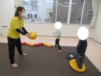 先生と一緒にボールパス!バランスボードに乗ってキャッチ&パス♫