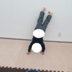 平均台を使って壁倒立の確認、練習をしてから本番。手の位置、足の位置などに気をつけて倒立できました。