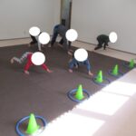 お尻歩きから動物変身歩きでゴールへコーンを運びました。
