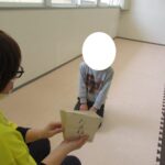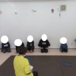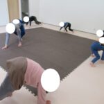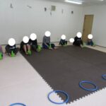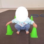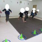 フープとコーンでGO!STOP!クマ歩き、お尻歩き、カンガルージャンプでゴールを目指して進みました。