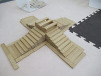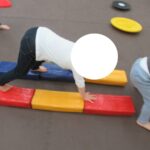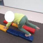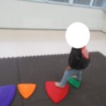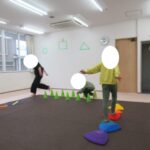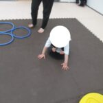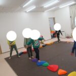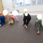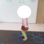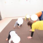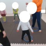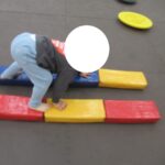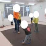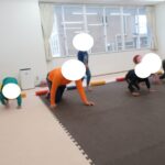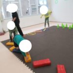 フープジャンプ、平均台クマ歩き、バランスボード、カラー石渡り、アヒル歩きでコーンタッチを行いました。