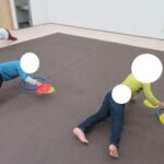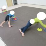 クマの姿勢でカップ移動に挑戦。体や姿勢を意識して丁寧に行いました。